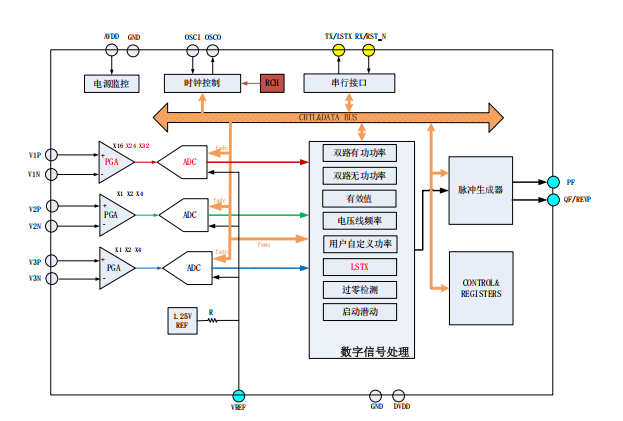 提供三路∑-△ADC,分别为电压通道(U 通道)、电流通道 A(IA 通道)、电流通道 B(IB通道)
