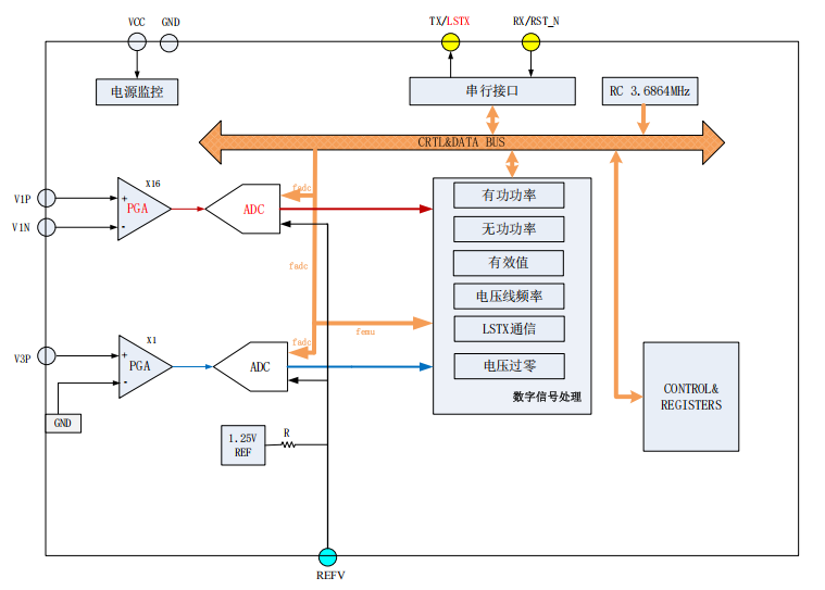 提供两路∑-△ADC,分别为电压通道(U 通道)、电流通道(I 通道)