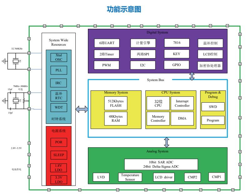 高集成:集成32bit ARM Cortex-M0、计量模块、硬件温补RTC、 LCD控制器;