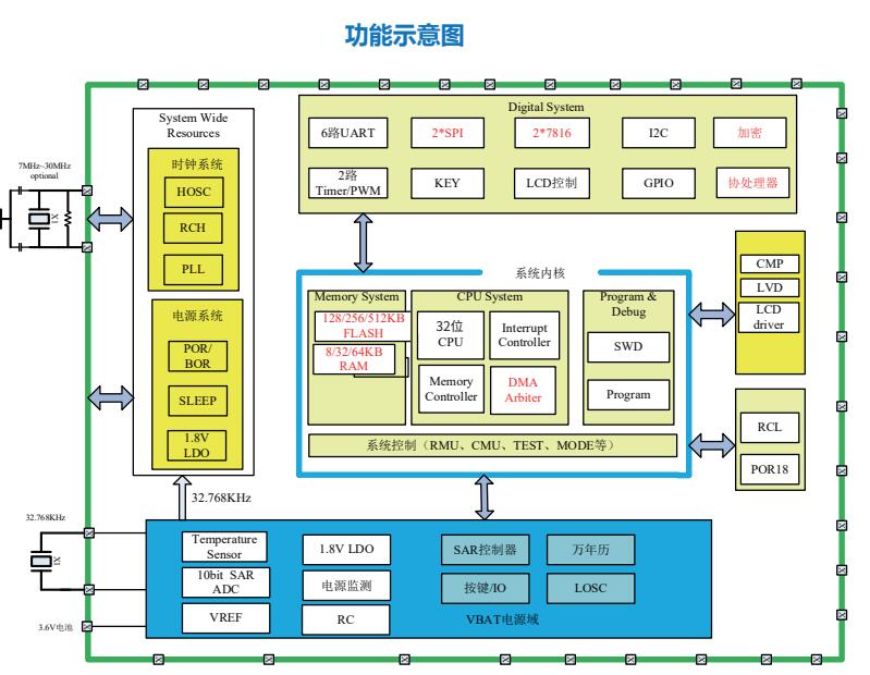 其他外设:丰富外设,支持6路UART、4路SPI,支持DMA,I2C、KEY、INT、7816、AIN等外设,支持硬件看门狗
