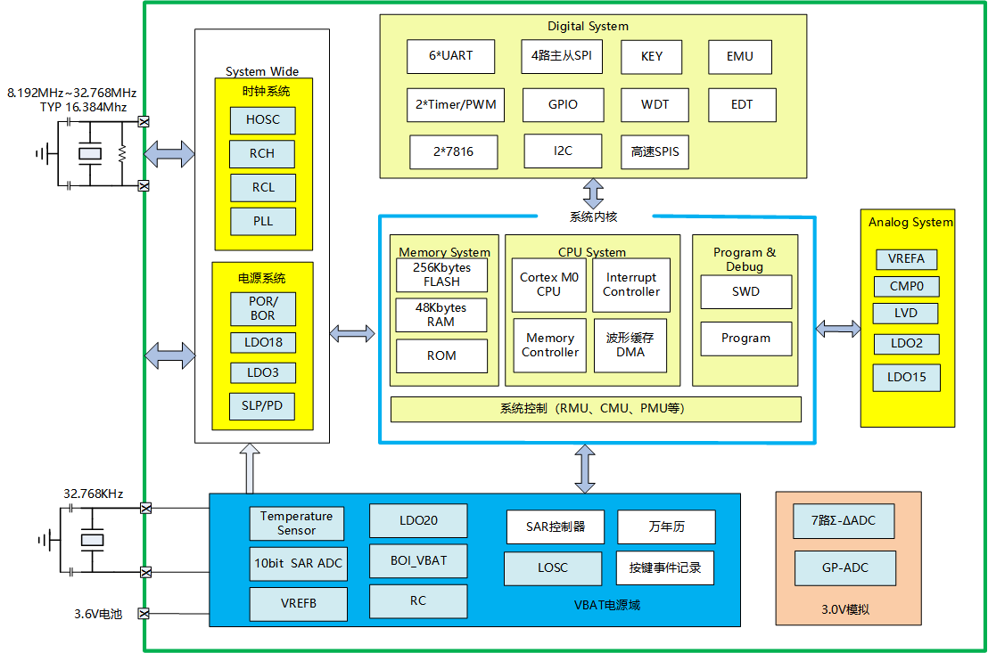 ARM Cortex-M0内核,最高运行频率可达32.768Mhz,典型运行频率16.384Mhz