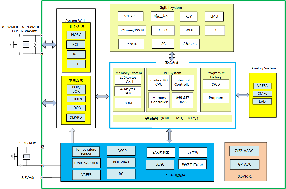 ARM Cortex-M0内核,最高运行频率可达32.768Mhz,典型运行频率16.384Mhz